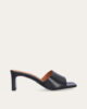 Handcrafted sandal with heel, crafted in black smooth leather with a square toe. The sandal features a wide strap across the front with an stylish open toe-design and a high heel.