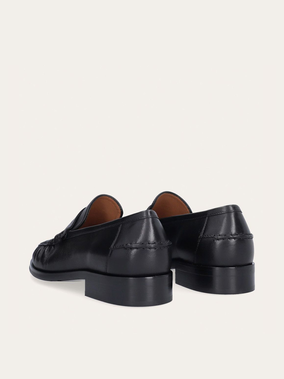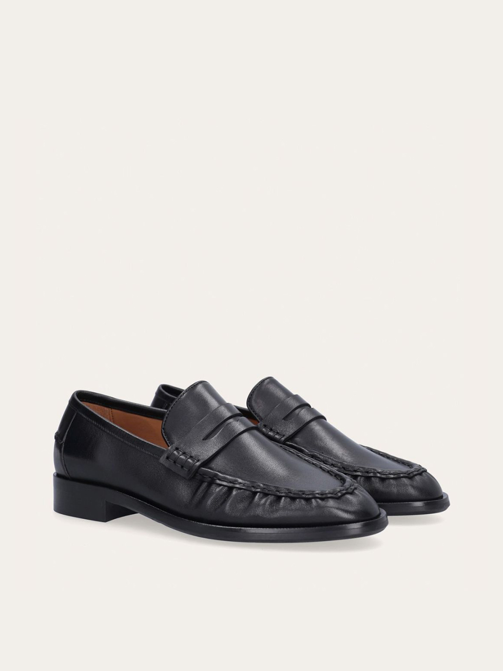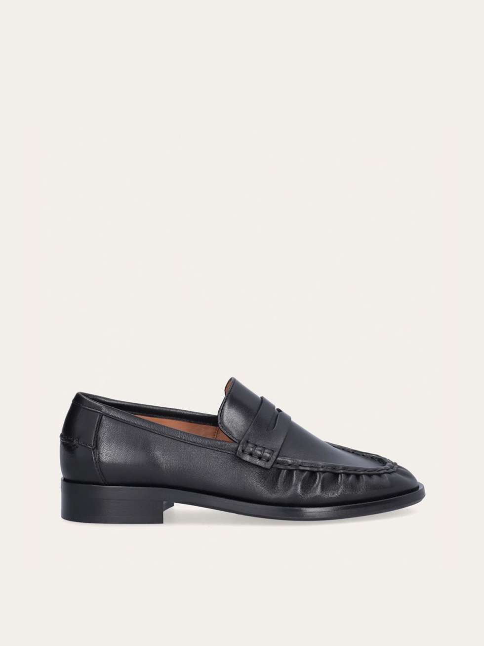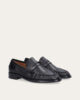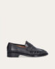 Handcrafted loafer, crafted in black smooth leather with a round toe. The forefoot is detailed with a distinct stitch that creates a slight gathering in the leather, underscoring the handcrafted finish and a strap across the front with a decorative cut-out.