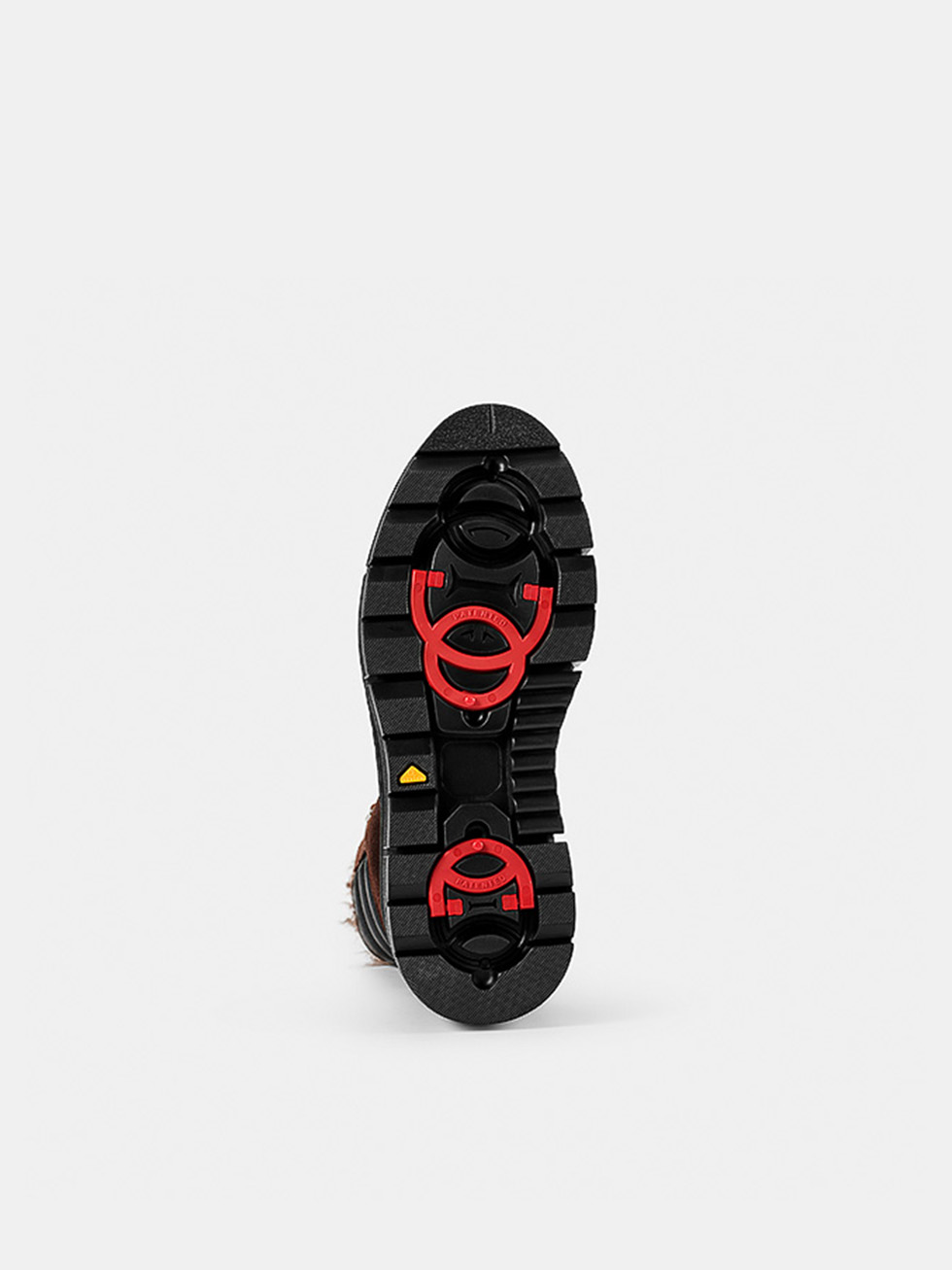 The outsole is light and stable and withstands ground cold. The boot is equipped with a system of fold-out spikes, which offers an immediate extra stable grip in slippery conditions on ice, slush and snow. The spikes are easily folded in or out as necessary with a spike key that comes with the purchase. The outsole is grippy even when the spikes are not unfolded.